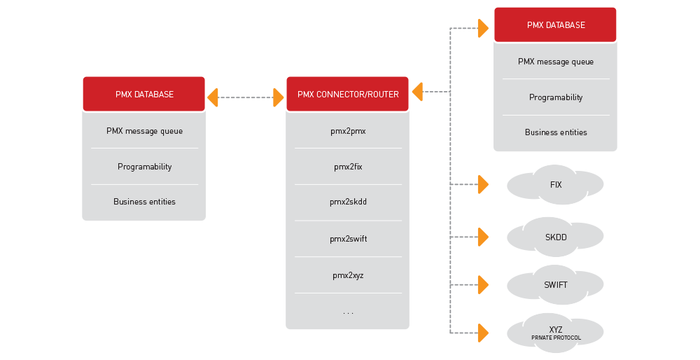 - Integralni dio svakog PMX sustava je PMX message queue koji sadrži svaki poslovni događaj ili entitet koji treba poslati ili primiti u PMX sustav u obliku generičke XML poruke. Prilikom slanja poruka, PMX connector/router pretvara generičke poruke u specifični format (SWIFT, FIX...) i šalje primatelju. Prilikom primanja poruka, PMX connector/router pretvara poruku u generički XML format i zapisuje u message queue.